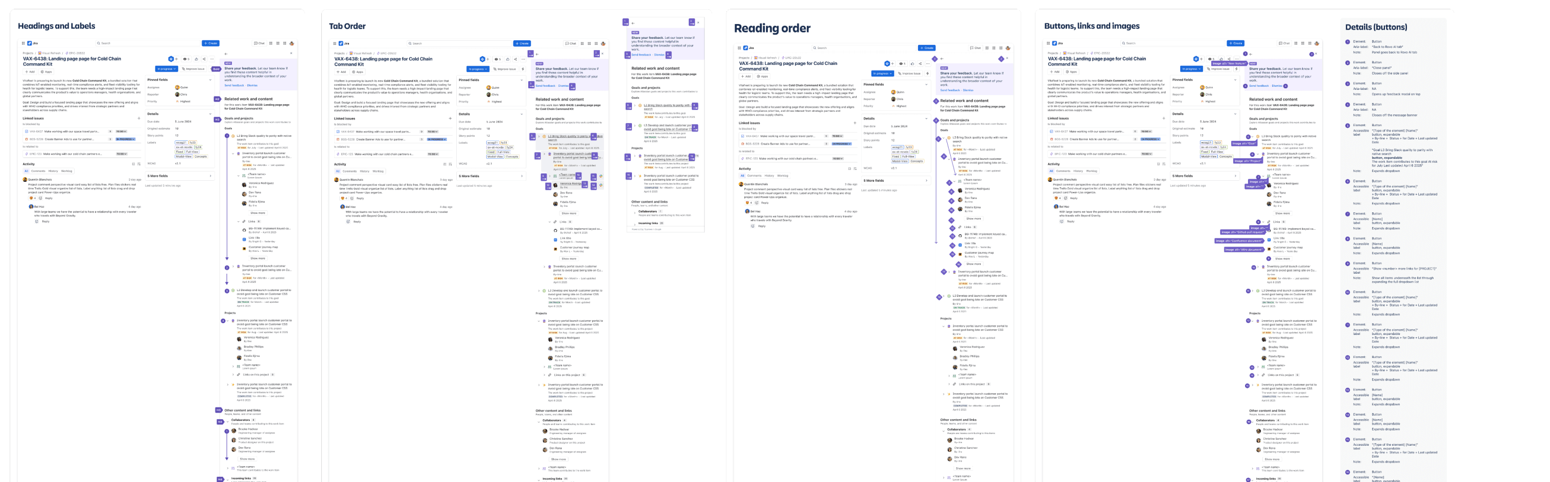 Information Architecture - Some inconsistencies between the information hierarchy of the 2 side panels slowed some participants in understanding the sections layout. → Explore the information hierarchy to see where we can reduce cognitive load by using the same content structures across the products. More info: 30% UX review - Context panel in Confluence