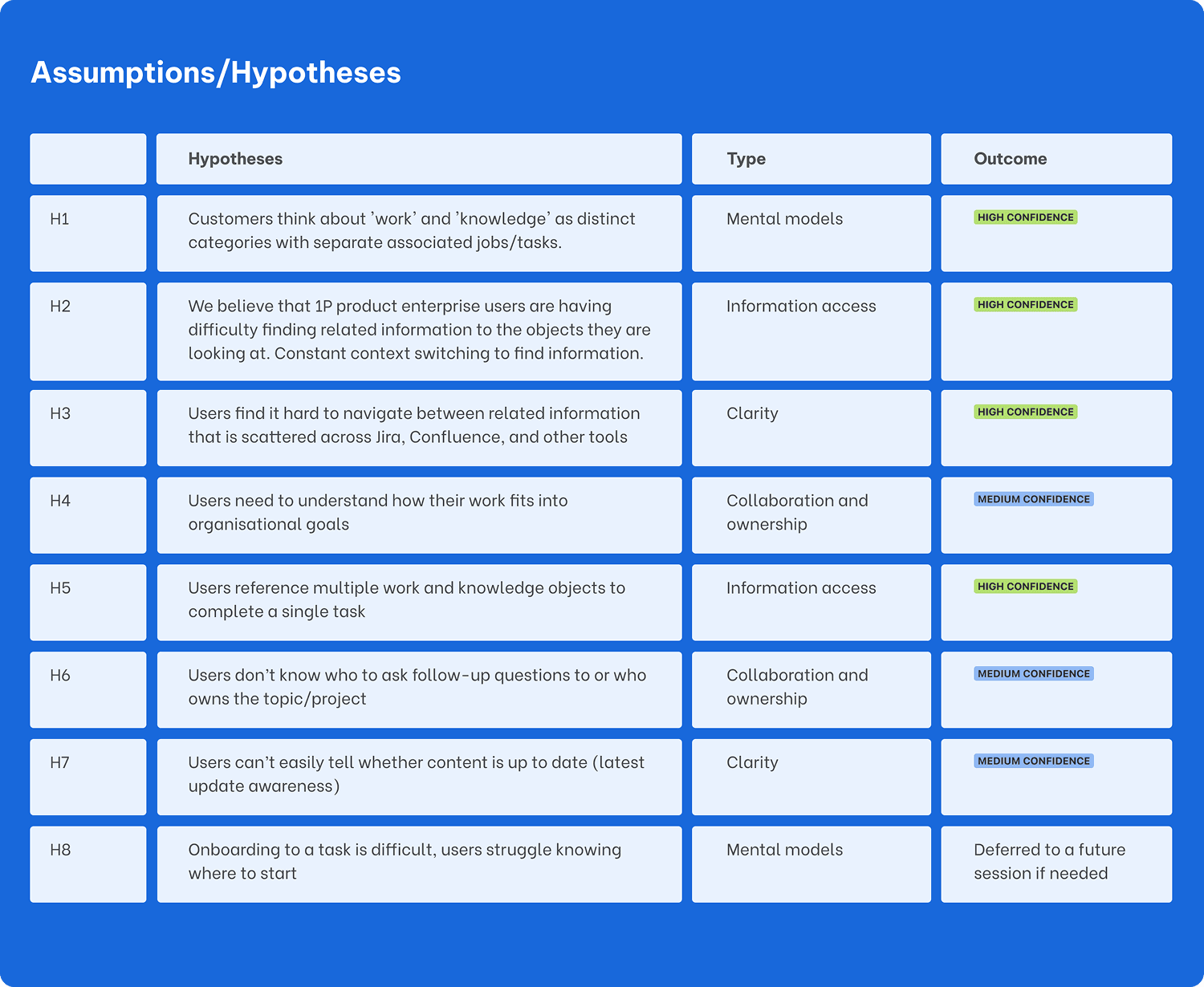 The research sessions engaged enterprise users across roles working in Jira and Confluence daily. The team tested two design prototypes (hierarchical and grouped layouts), while also exploring foundational concepts around how users find, understand, and connect related information.