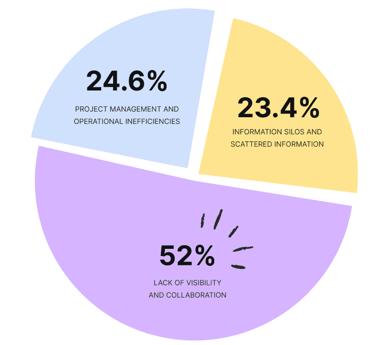 The use of multiple, uncoordinated tools across teams causes information to be stored in various locations (Google Drive, Slack) without a centralised communication space so employees spend excessive time searching for data.
