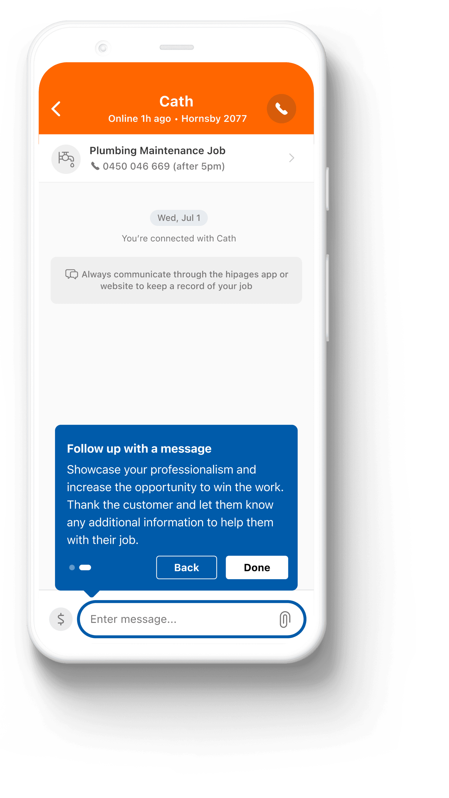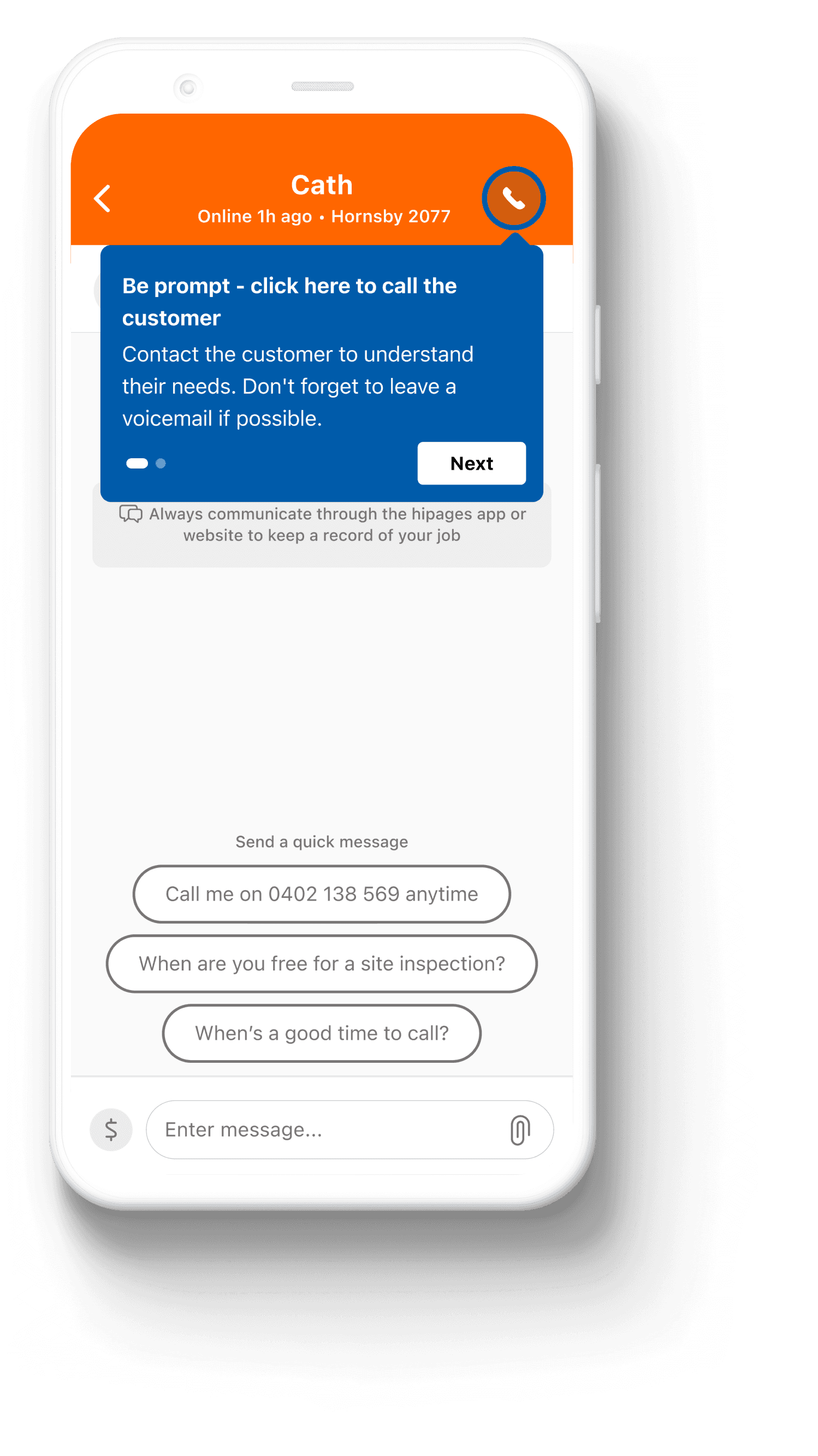 When the user accepts a job lead for the first time, they’re shown the message centre with new tooltips highlighting the call button and the message input field.