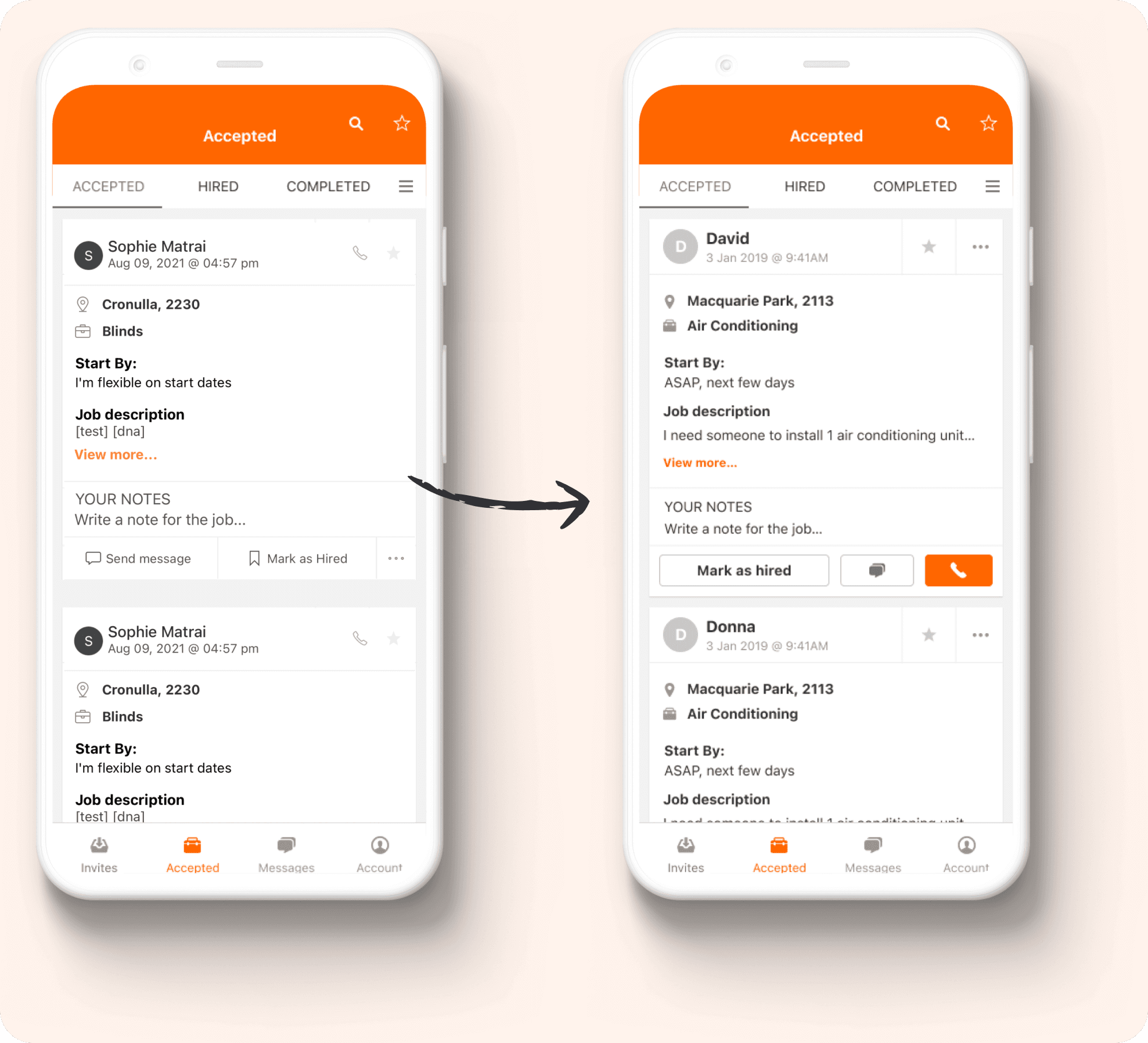 In order to help tradies take the best action, I reordered the accepted job lead card buttons to highlight the call icon as the number one action. I placed the message icon on the right side, while I placed the “Mark as hired” button as a tertiary action.