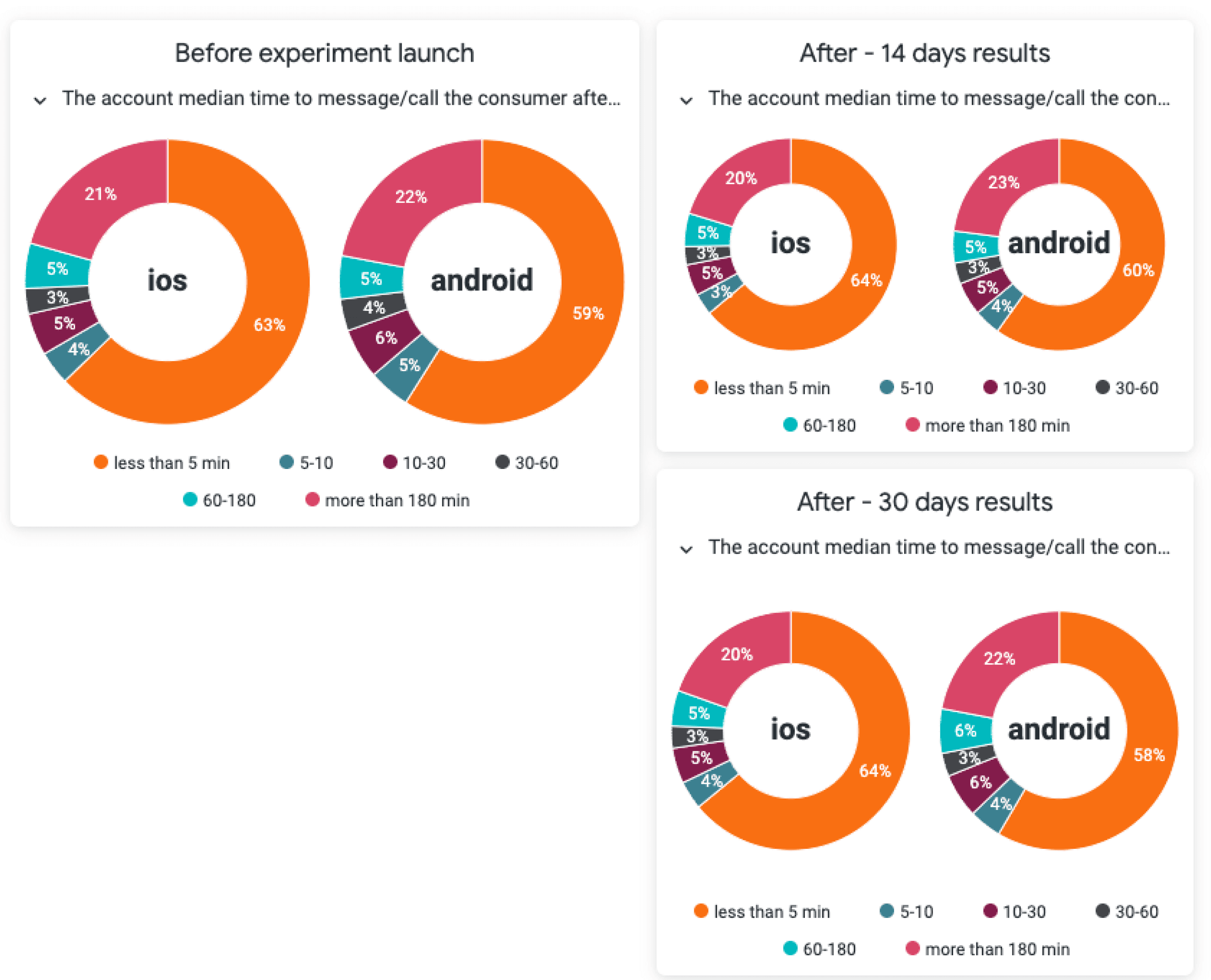 We analysed the experience from two angles: the distribution of the time taken to process a claim and the distribution of time taken to respond for all accounts, based on the account median time to response. last, we looked at the intervals of 14 days and 30 days after the new features were released.